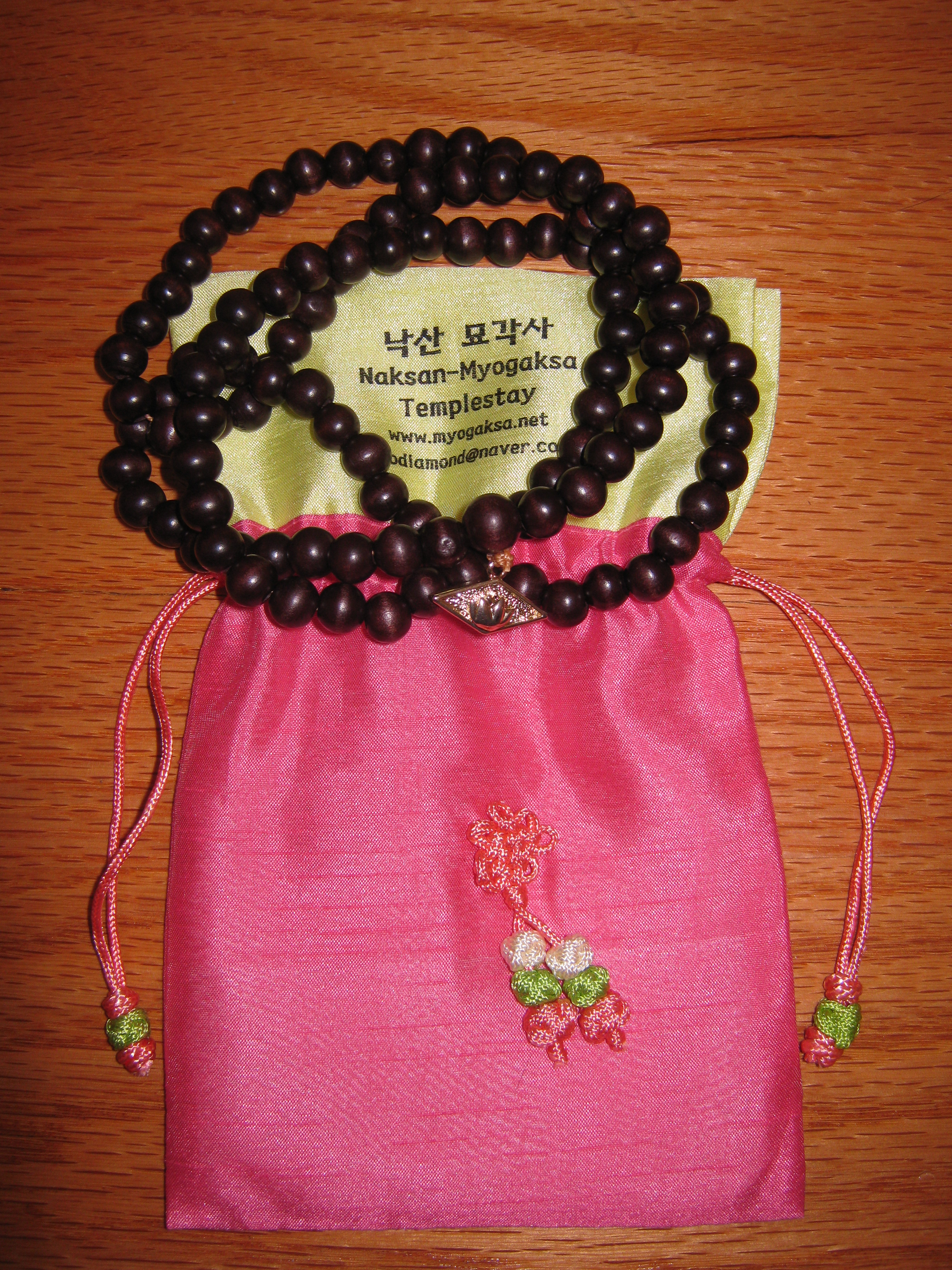 Sunim started off by demonstrating the proper form of Korean prostrations. Then she instructed me on the procedure for making a mala (Buddhist rosary): I was to prostrate, string one bead while still kneeling, then stand, prostrate again, string another bead, and so forth, until the full mala of 108 prayer beads was complete. During each prostration, I was to have the mental focus of laying down my regrets, sort of expressing an apology to myself and to the universe for all my thoughts and actions undertaken under the influence of the three poisons of greed, anger, and foolishness. I had plenty of mental material to fill those 108 prostrations! I felt something very powerful when I finished and the temple assistant tied the mala together and handed it to me, a physical reminder of my past regrets and current aspirations for future virtuous conduct.