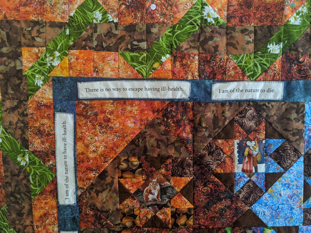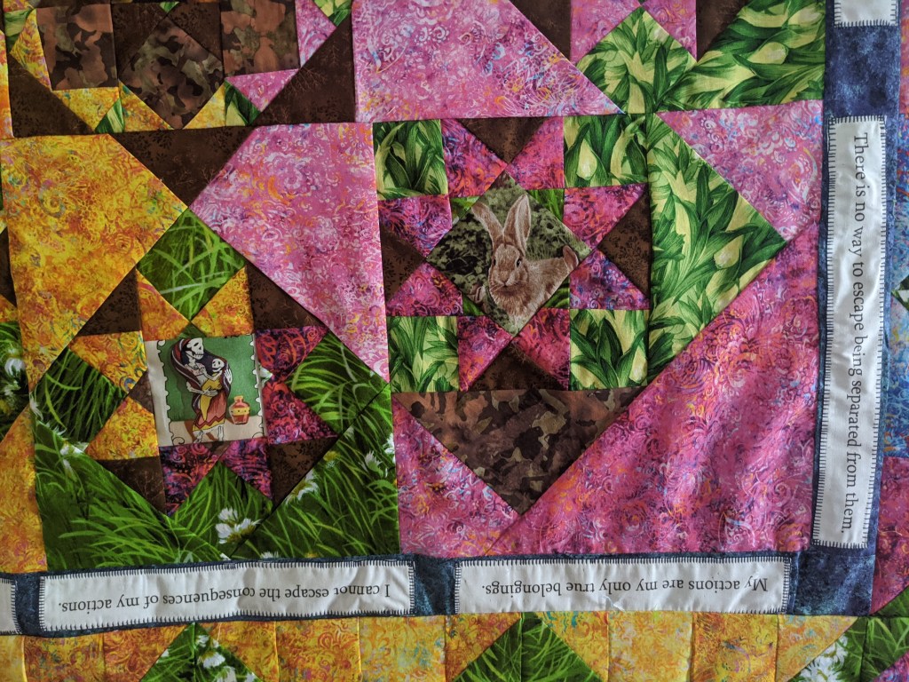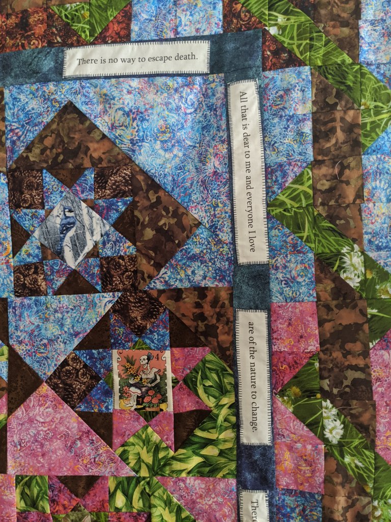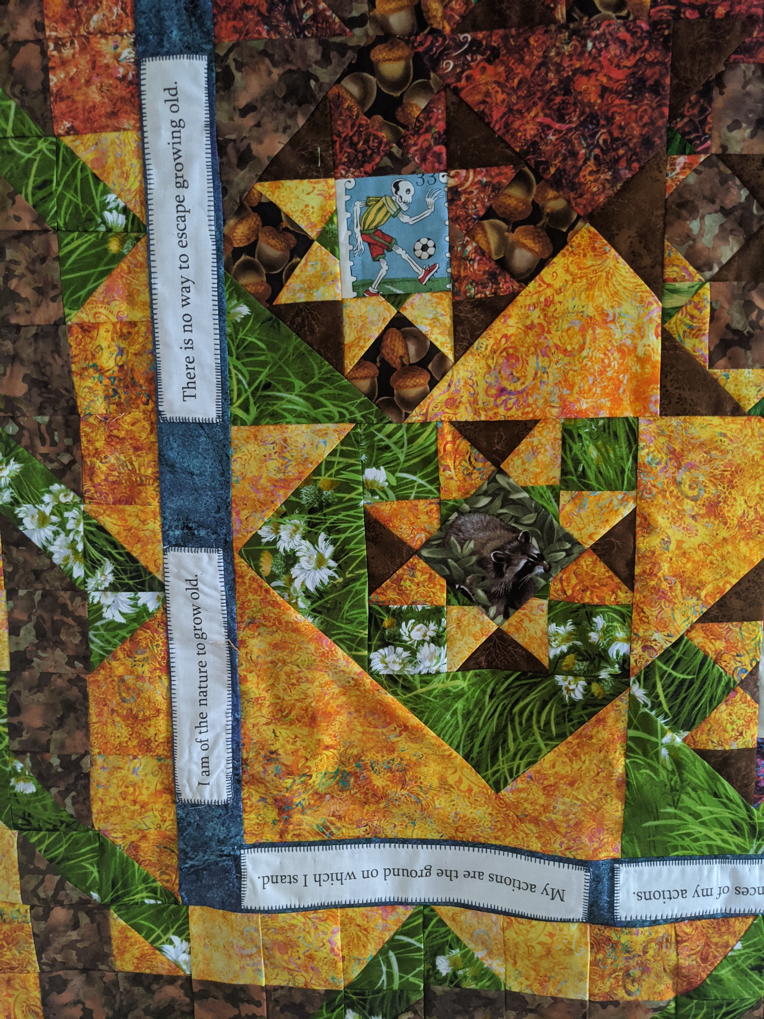 I chose a seasonal assortment of fabrics to represent that these truths ring true throughout all time. There is blue for the winter, pink for spring, yellow for summer, and orange for autumn, with corresponding creatures to represent each time period (blue jay, rabbit, raccoon, squirrel, respectively). There are also four skeletal humans from a Day of the Dead fabric to represent that the Five Remembrances apply to all people at every stage of life, no matter their occupation or any other personal characteristic.