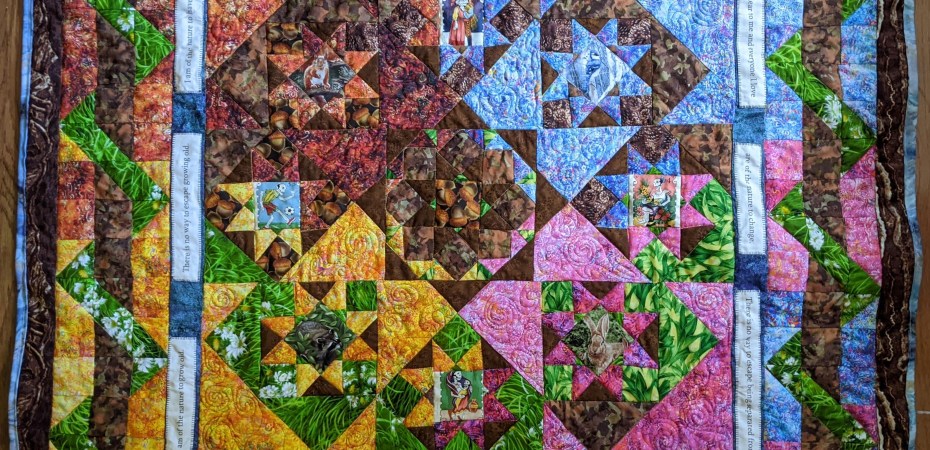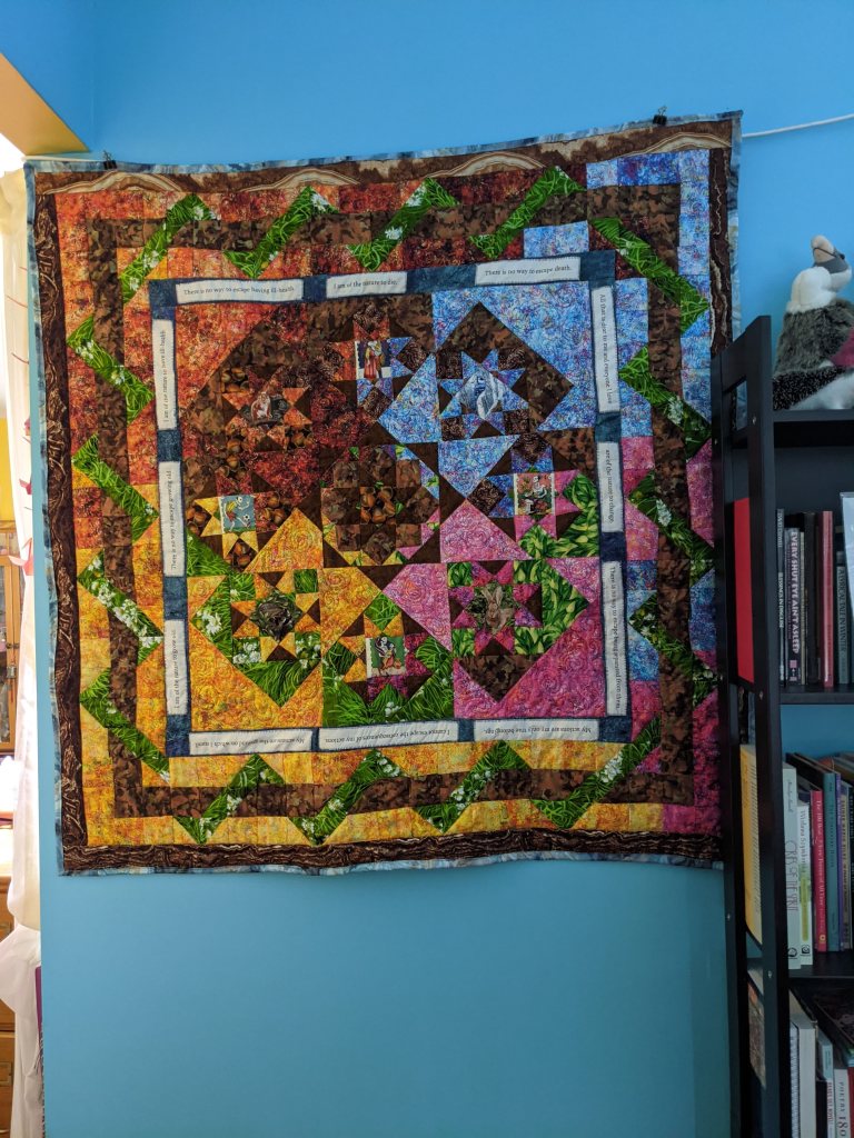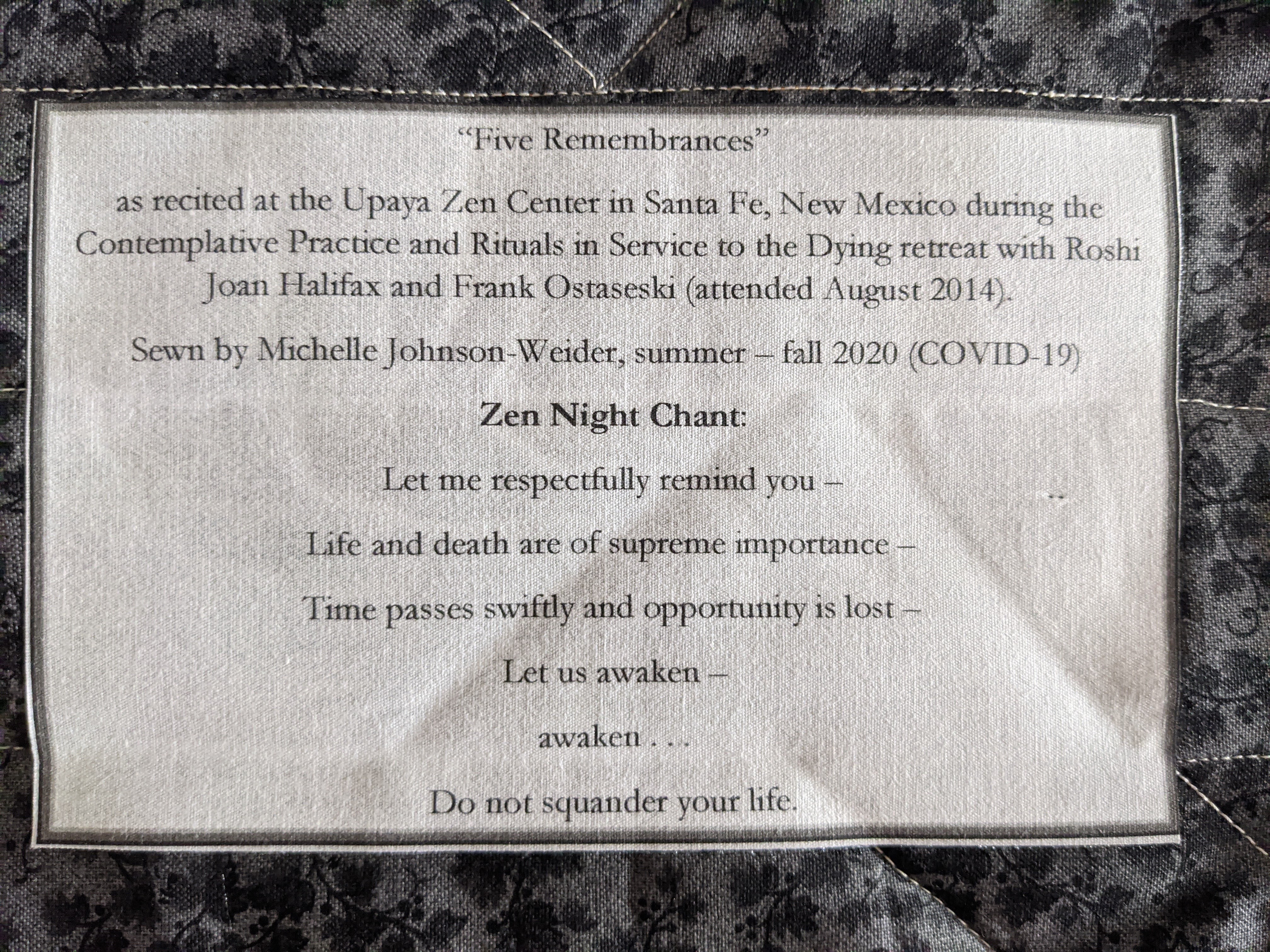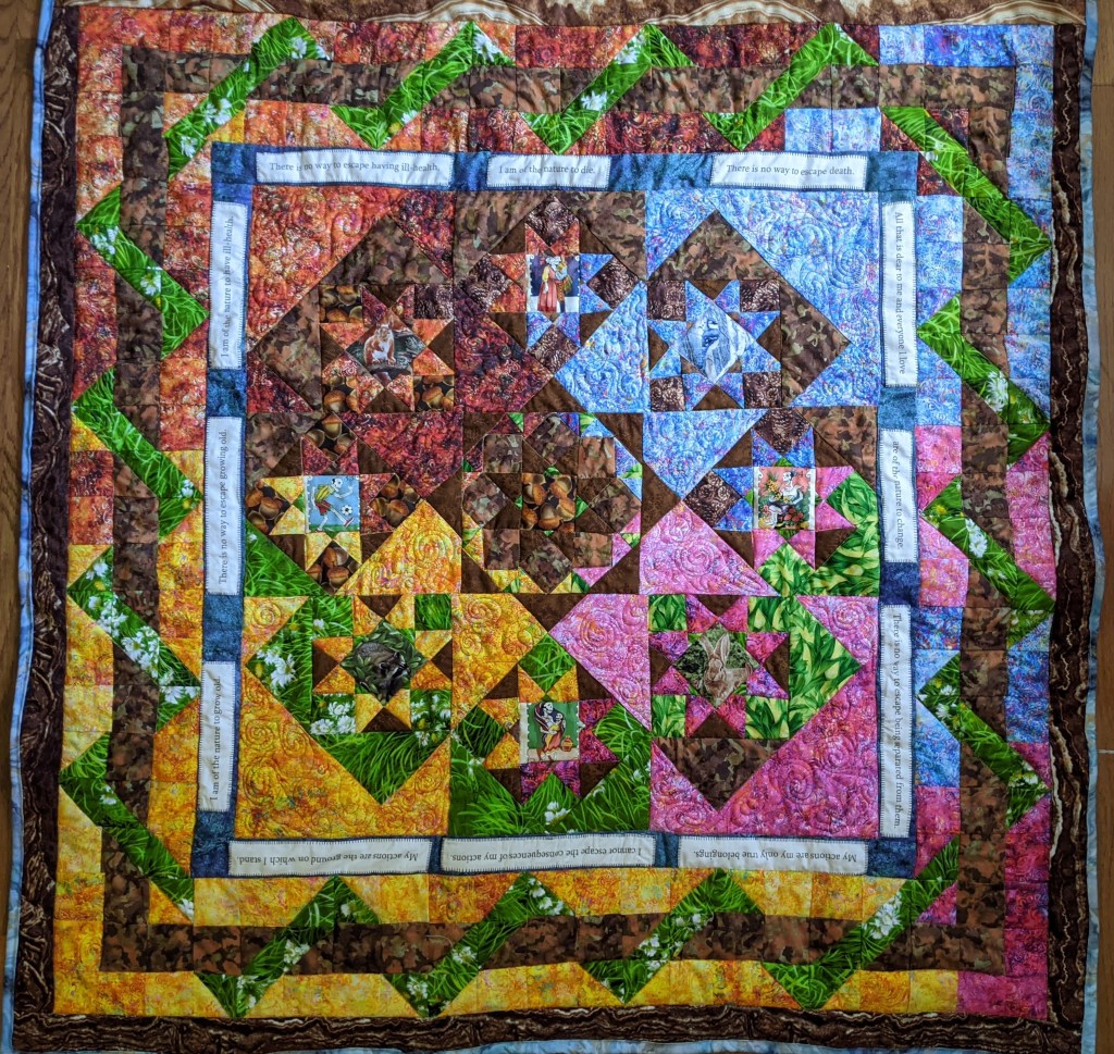 I chose a seasonal assortment of fabrics to represent that these truths ring true throughout all time. There is blue for the winter, pink for spring, yellow for summer, and orange for autumn, with corresponding creatures to represent each time period (blue jay, rabbit, raccoon, squirrel, respectively). There are also four skeletal humans from a Day of the Dead fabric to represent that the Five Remembrances apply to all people at every stage of life, no matter their occupation or any other personal characteristic.