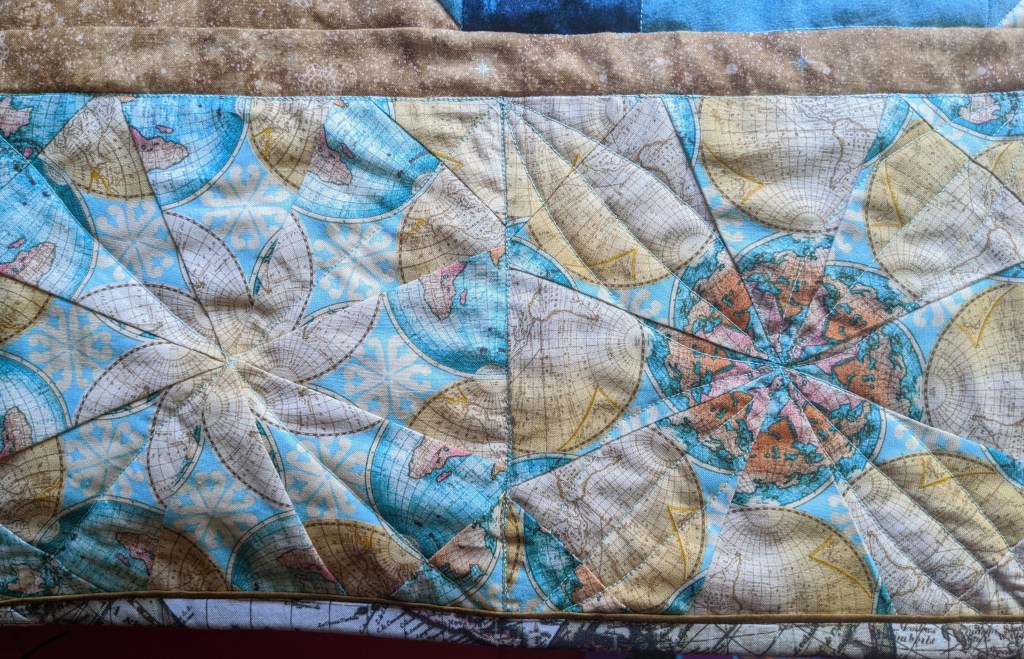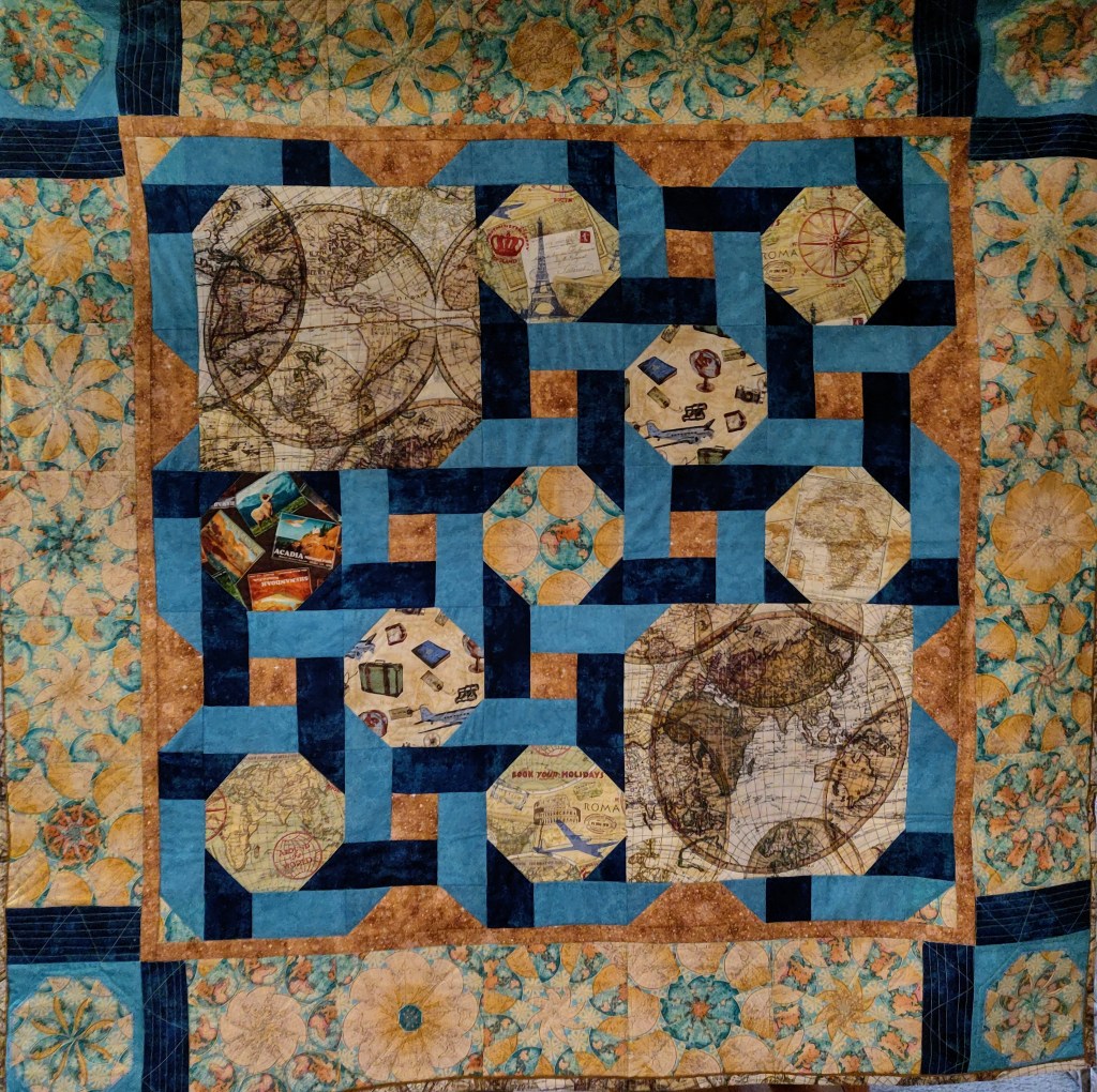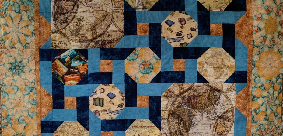 This quilt was my first to use the One Block Wonder method for octagons. The OBW octagons make up the border while the central body of the quilt is a version of Around the Twist from the book Big-Print Patchwork by Sandy Turner. I’ve owned that book for years and had my eye on that pattern in particular for a long time. I was excited to finally find the right project to use it. I fussy cut fabrics featuring world maps, airplanes and luggage, U.S. national park symbols, and the iconic Eiffel Tower, all to symbolize some of the very many cities, countries, and continents my parents have visited over 50 years of travel. [For the uninitiated, “fussy cut” means to cut out a specific image from fabric, rather than cutting straight down the fabric as you usually would.]
