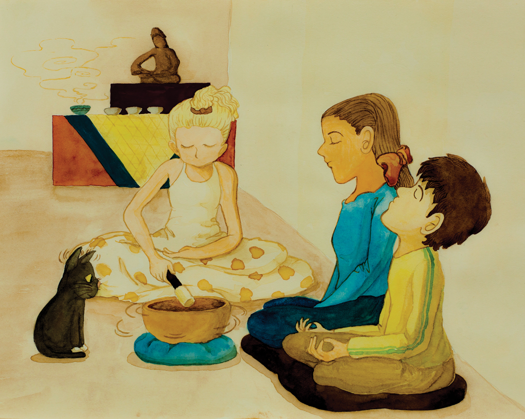 My efforts to include my children in my Buddhist practice first involved the development of a simple prayer and guided meditation practice, which is recounted in the titular story of In the Garden of Our Minds and other Buddhist stories. When my children got older, they were able to join me in short periods of sitting meditation.