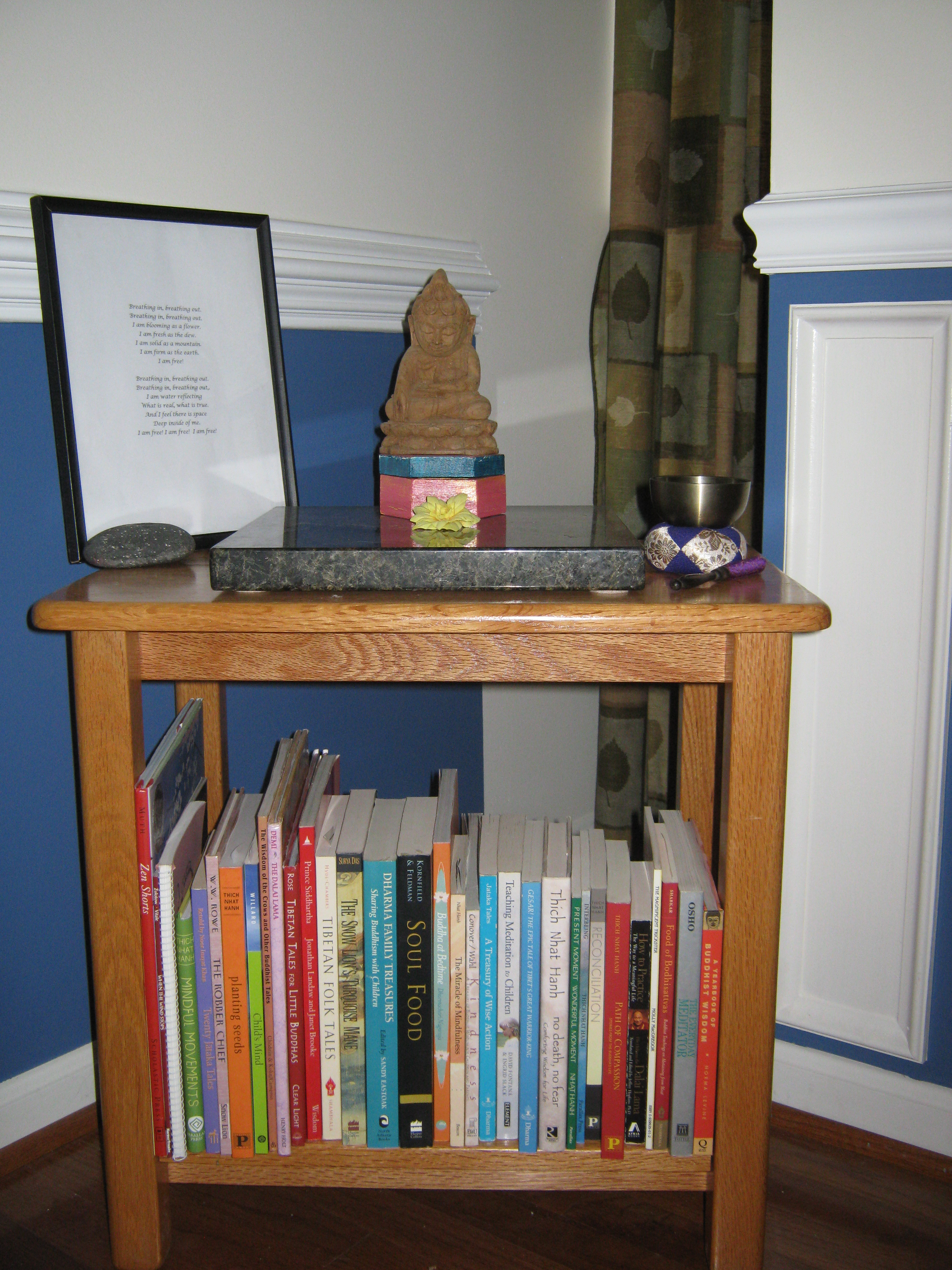 I began by setting up a Breathing Corner as suggested by Thich Nhat Hahn (see for instance Making Space: Creating a Home Meditation Practice) for people who can’t devote a whole room to “breathing and peace of mind”. Ours is a simple, peaceful corner of our dining room, with a small table on which I’ve placed a lovely little Buddha statue that was a gift from my parents, a river rock, a little silk flower, and a mindfulness bell. Underneath the table is an assortment of appropriate books and nearby I keep three Mexican blankets and three cushions for sitting. Lastly, I printed up and framed the following meditation gatha: